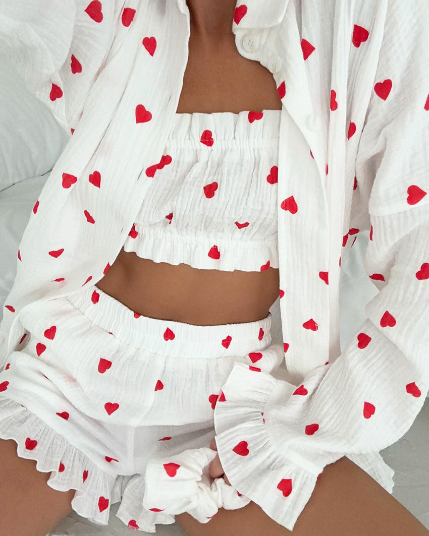 Casual And Sweet Heart Shape Printed Bell Sleeve Lace Three-piece Homewear
